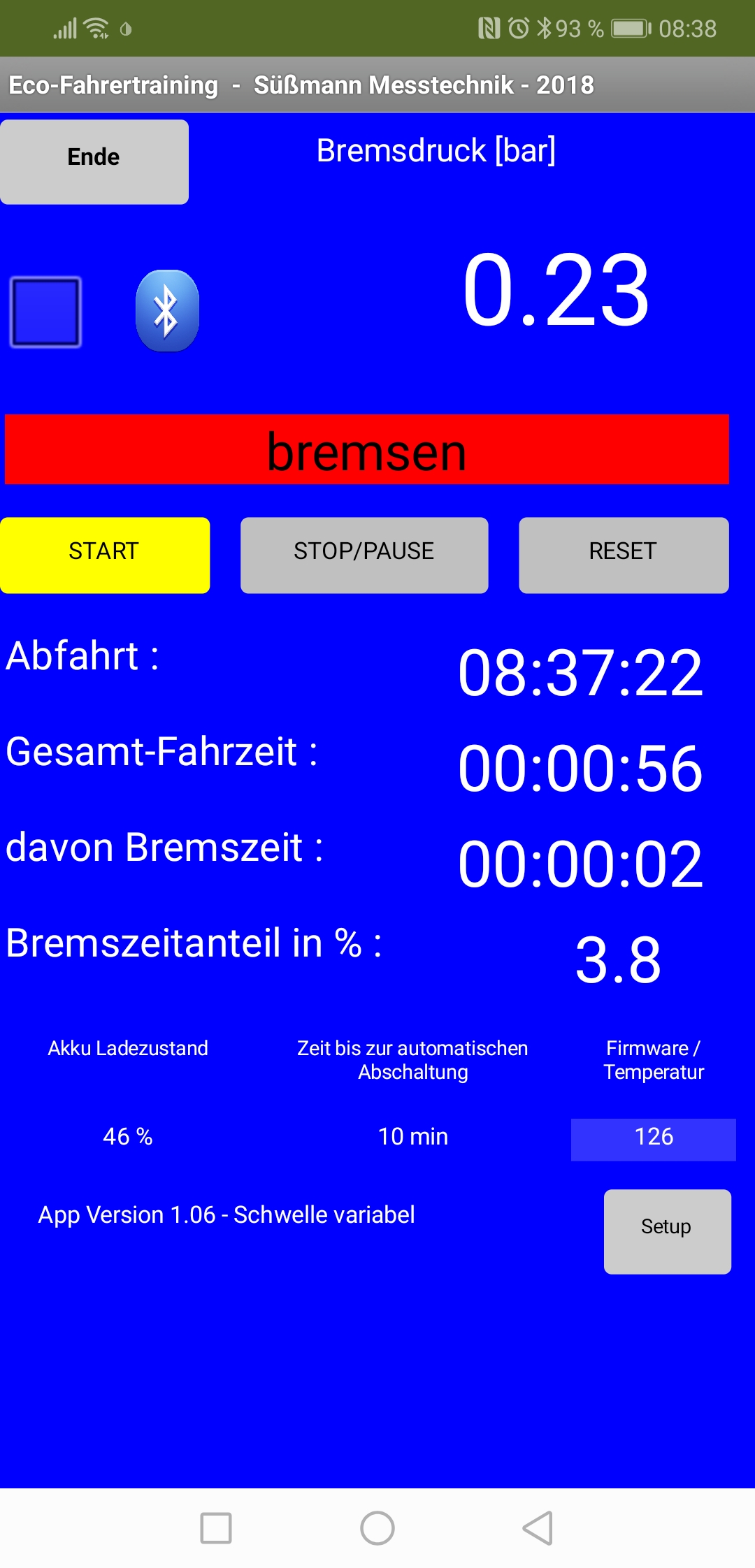 | Durch setzen der Checkbox neben einem Bluetooth-Symbol wird der entsprechende Druck per Sprachausgabe angesagt. Die App kann dann z.B. hinter der FSD-Anwendung weiterlaufen. | Beim Überschreiten einer einstellbaren Druckschwelle wechselt die Anzeige von "fahren" auf "bremsen" und die Bremszeit wird aufaddiert. | |