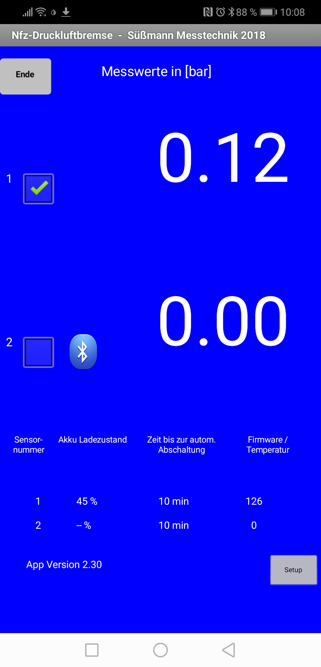 | Durch setzen der Checkbox neben einem Bluetooth-Symbol wird der entsprechende Druck per Sprachausgabe angesagt. Die App kann dann z.B. hinter der FSD-Anwendung weiterlaufen. | Beim Überschreiten einer einstellbaren Druckschwelle wechselt die Anzeige von "fahren" auf "bremsen" und die Bremszeit wird aufaddiert. | |