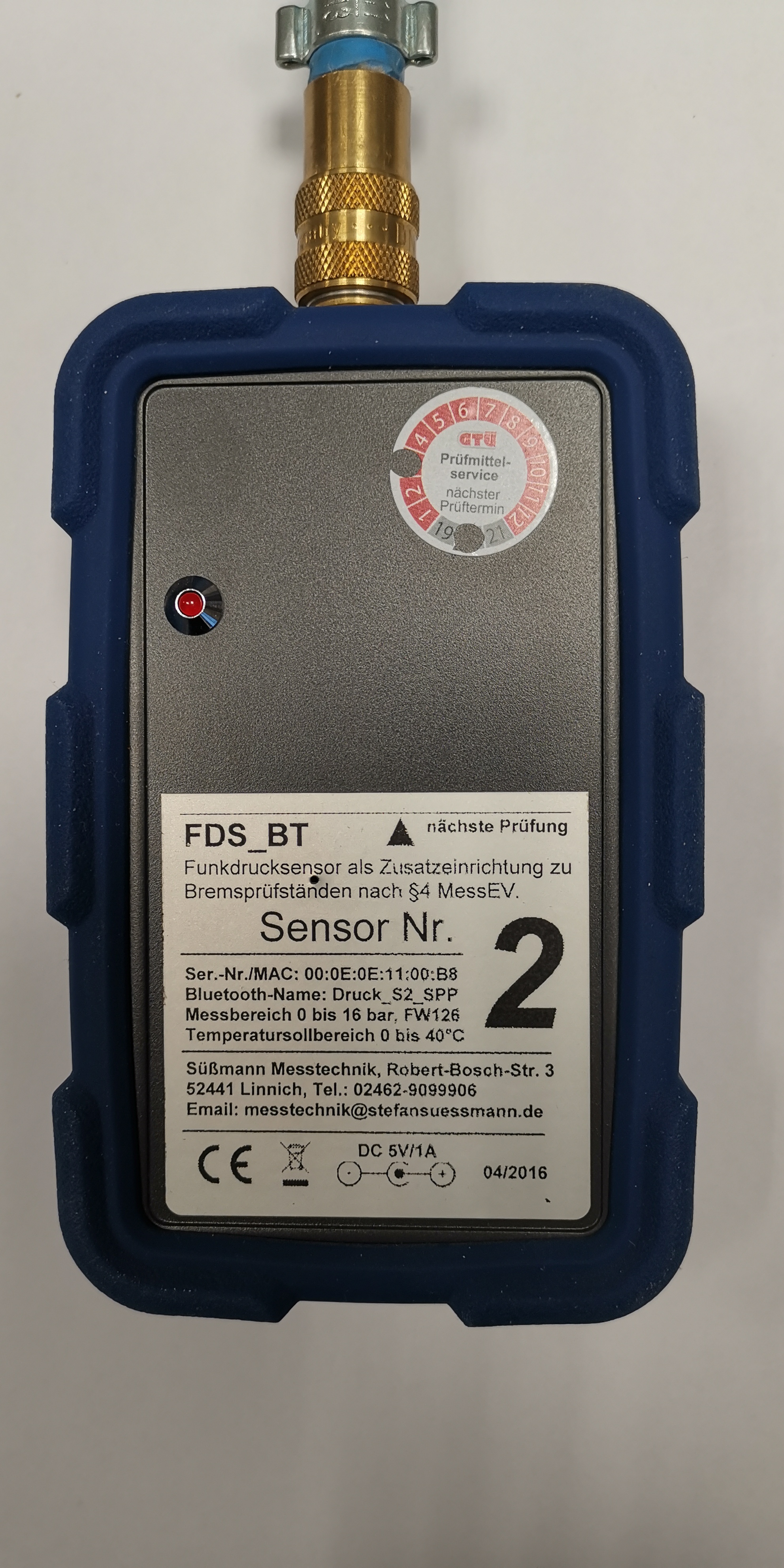 | Der Sensor hängt frei mit einem 20cm Druckluftschlauch am Prüfanschluss der Bremse. |